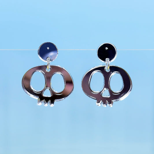 Silver Mirrored Skull Hanging Post Earrings