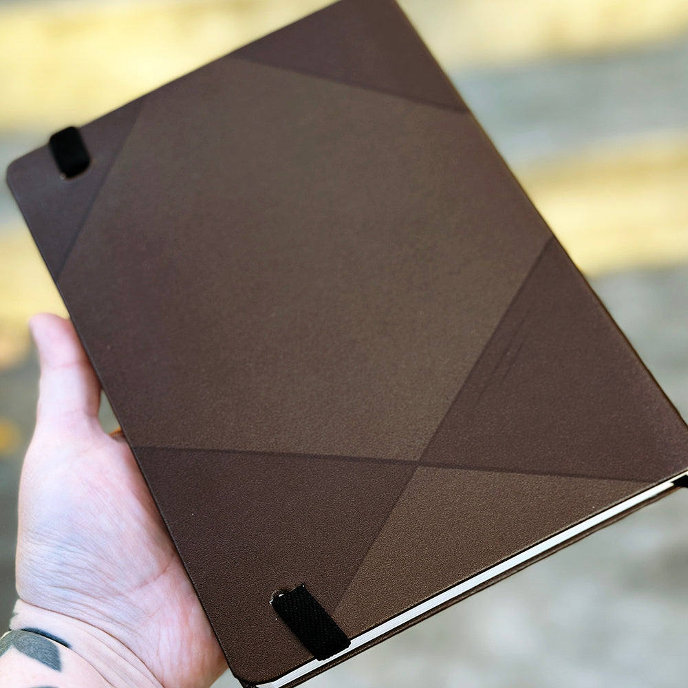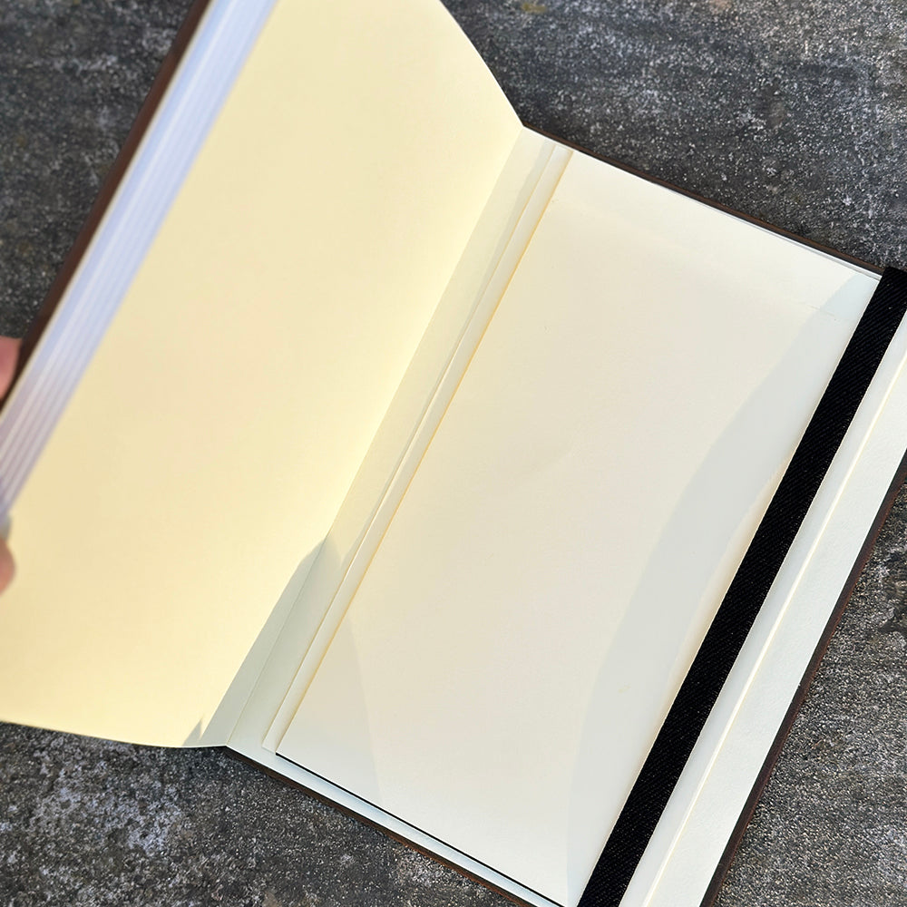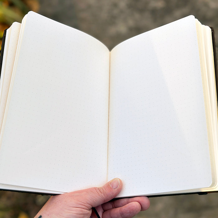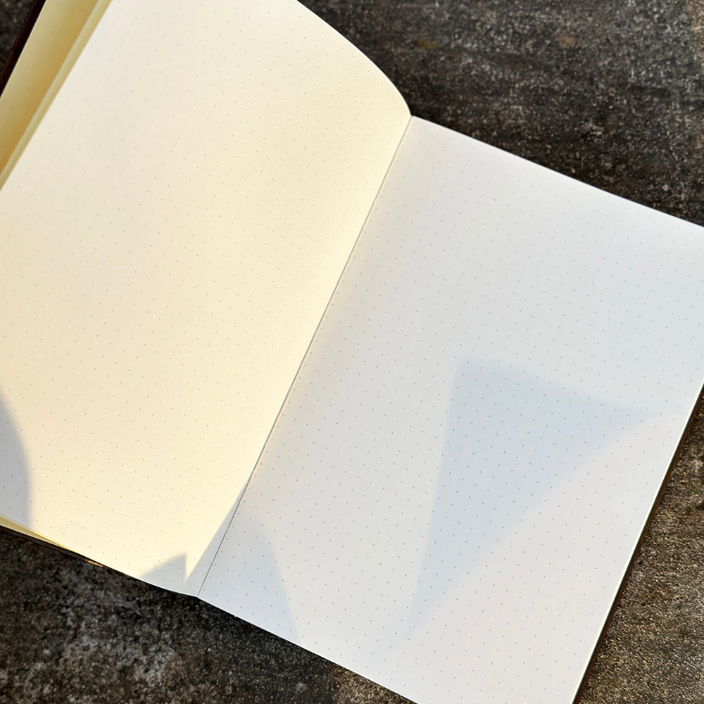 An A5 (5.83"x8.27") sized, 96-page, faux leather-covered dotted page journal! Each journal has a ribbon bookmark, an elastic strap, 180 degree flat binding, waterproof cover and a small folder on the inside back cover.